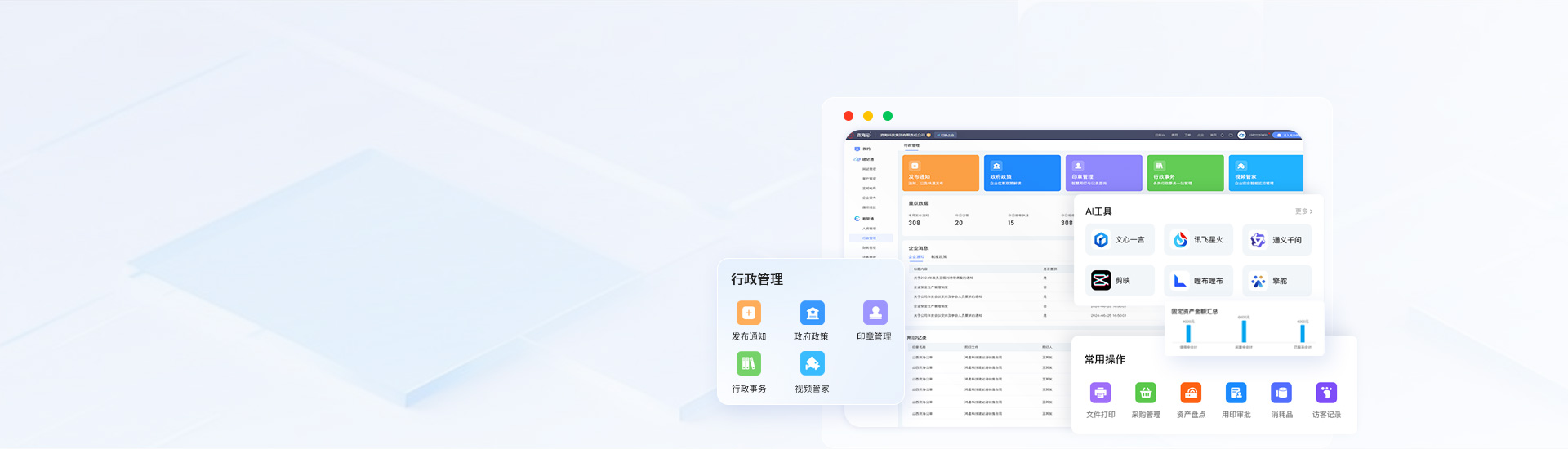 行政管理系統(tǒng)涵蓋信息發(fā)布、政策導航、行政事務(wù)、資產(chǎn)管理、運營分析等功能,同時推出智能印章、視頻管家等智能硬件,軟硬件結(jié)合,提升企業(yè)管理效率、為企業(yè)實現(xiàn)降本增效。